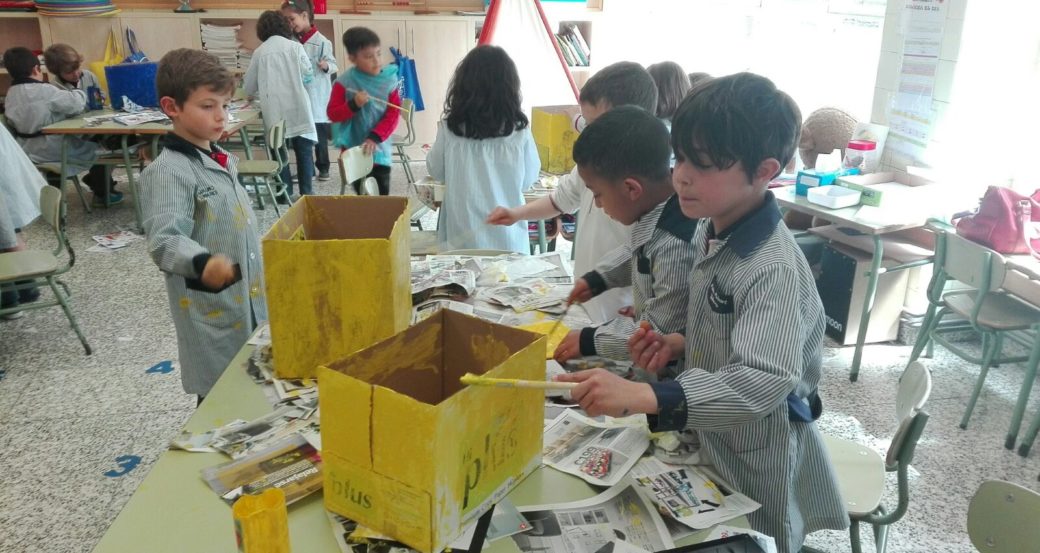 A més a més hem reutilitzat caixes per fer contenidors per a totes les classes.