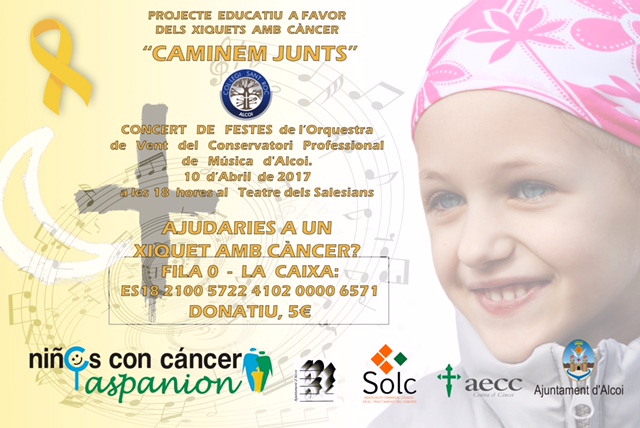 Se acercan la fiestas de Moros y Cristianos de Alcoy, y como no podía ser de otra manera, vamos a organizar un nuevo concierto, en este caso de música festera, a favor de los niños con cáncer. El mismo estará interpretado por la Orquesta de Viento del Conservatorio profesional de Música de Alcoy, bajo la dirección del maestro Gregorio Casasempere. El acto estará presentado por María Bernabéu, profesora de la ESO de nuestro colegio San Roque. Tendrá lugar el próximo LUNES 10 de ABRIL de 2017, a las 18 horas en el teatro Salesianos de Alcoy.