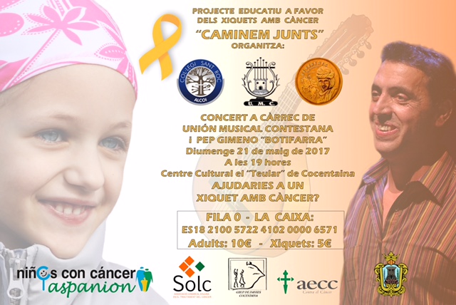 A esperas de concretar el concierto de la Orquesta Sinfónica Alcoyana para el próximo 17 de junio como actividad estrella de CAMINEM JUNTS, este fin de semana, dentro de nuestro proyecto contra el cáncer infantil, tenemos nuestros últimos actos solidarios para recaudar contra esta terrible enfermedad. Una amplia gama de actuaciones culturales, divertidas y solidarias para todos los públicos, por tanto ideales para compartir en familia. Tenemos entendido que vendrá gente de fuera del territorio valenciano exclusivamente para asistir a alguno de los actos que os presentamos a continuación: