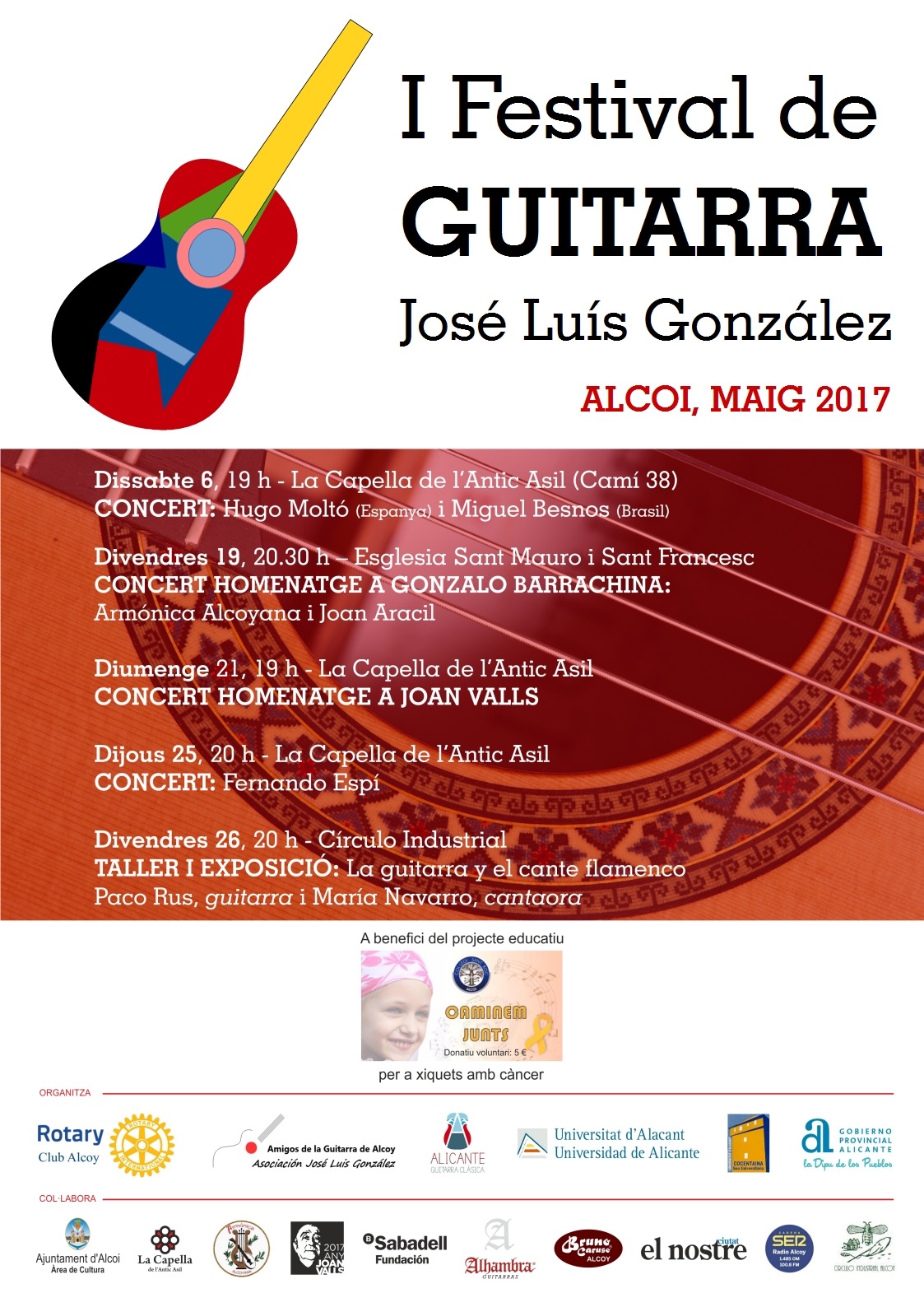- El domingo, día 21 de mayo a las 19 horas, en la capilla del antiguo asilo, se interpretará el concierto de guitarra más importante del I Festival José Luis González: el HOMENAJE AL POETA JUAN VALLS.