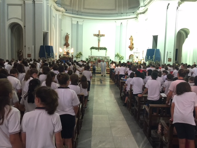 El pasado viernes pasado celebramos la fiesta escolar de nuestra patrona la Virgen de los Lirios, patrona de nuestra ciudad. Salimos de clase, con alimentos para realizar la ofrenda a la Virgen. Una vez entregados los productos, que acabarán en Cáritas Alcoy, realizamos la celebración dirigida por el párroco José Luís, en la que hemos aprendido qué pasó aquel verano en la Fuente Roja y cómo aquel milagro ha convertido a la Inmaculada Concepción en la patrona de nuestra ciudad.