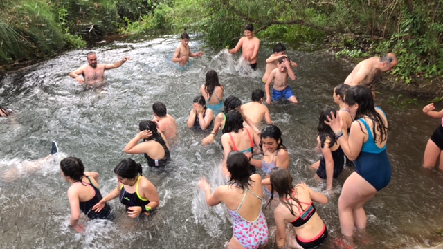 La verdad es que ha sido una mañana inolvidable. Hemos empezado con una asamblea muy divertida donde hemos aprendido varias canciones. Después hemos realizado los talleres naturales que ayer no pudimos llevar a cabo. Hemos acabado la mañana con un inolvidable baño en el río con una guerra de agua de las que marcan época. Por cierto, la comida, fantástica y abundante. Aquí publicamos unas emocionantes  imágenes que hablan por sí solas.  Nos preparamos para la noche…