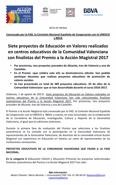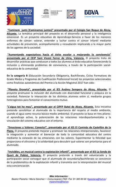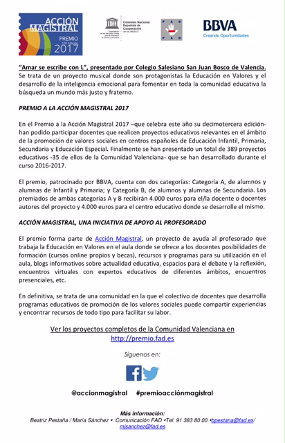 Nuestro proyecto educativo CAMINEM JUNTS sigue recopilando alegrías. Hoy hemos recibido una noticia muy agradable: uno de los jurados educativos más importante de nuestro país, como ya hizo en año pasado con nuestro FÉLIX NOS ENSEÑA, nos ha dado su “visto bueno” a nivel educativo y ha decidido que CAMINEM JUNTS sea uno de los 80 finalistas autonómicos de toda España para optar al Premio Acción Magistral, convocado por la Fundación FAD, el BBVA y la UNESCO. Ya podemos decir bien alto que otro proyecto del cole tiene el sello Acción Magistral.