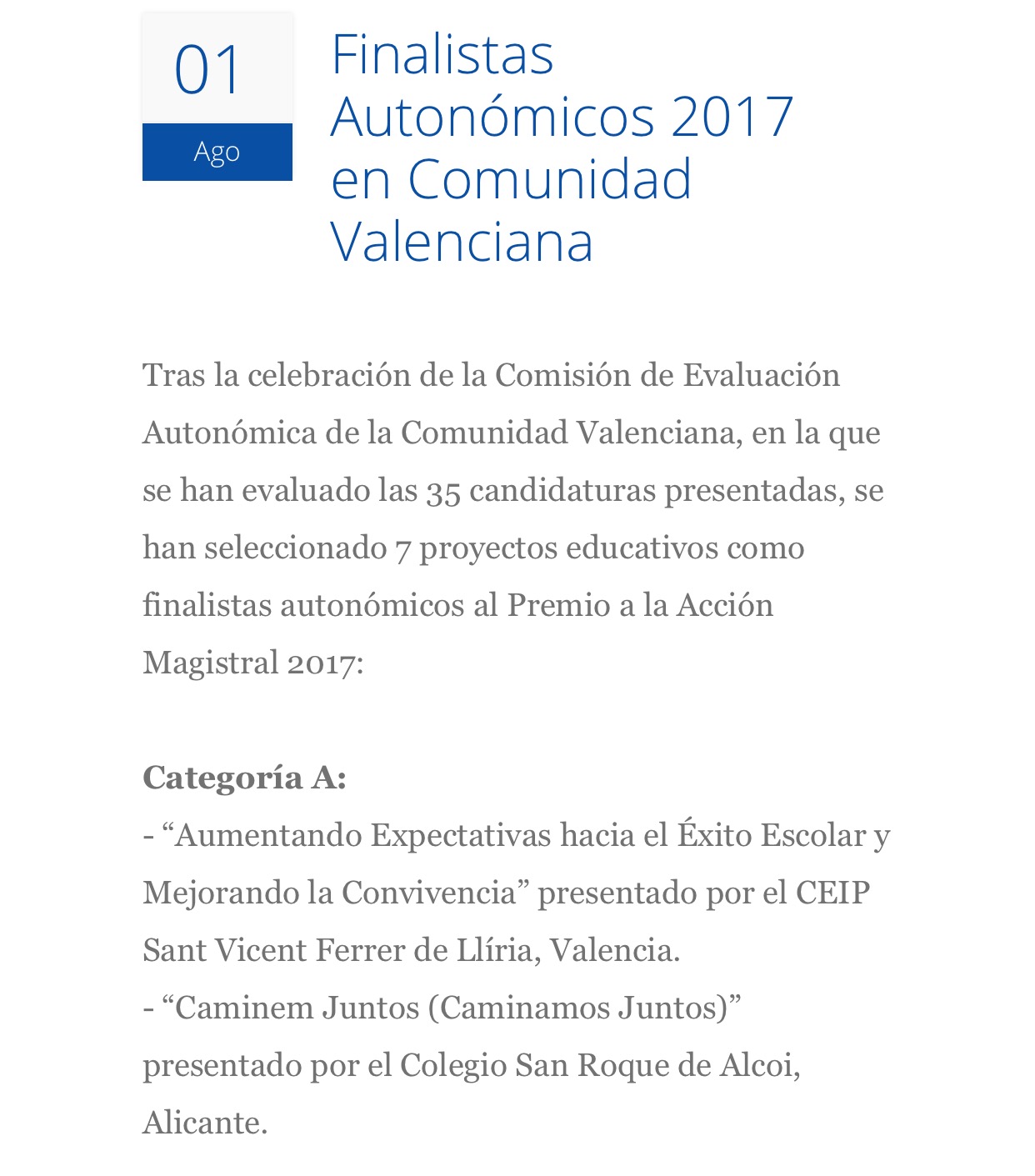 La última noticia ha sido tras la celebración de la Comisión de Evaluación Autonómica de Valencia, en la que se han evaluado las 35 candidaturas presentadas en la Comunidad Valenciana, se han seleccionado 7 proyectos educativos como finalistas autonómicos al Premio a la Acción Magistral 2017, entre los cuales se encuentra nuestro proyecto contra el cáncer infantil.