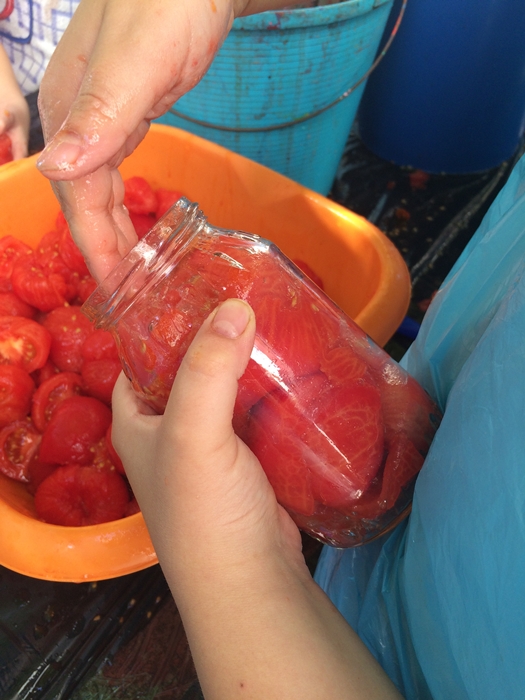 - Cortamos los tomates a trozos, tratando de eliminar en la medida de lo posible el exceso de agua e introduciéndolos en los botes a presión para que no quede aire. La idea era llenar al máximo los botes de tomate y acabar de llenar el espacio disponible con aceite de oliva para que no quede nada de aire en su interior.