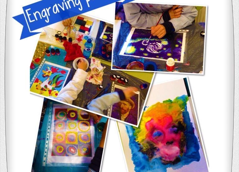 Last week we have done an amazing work with famous pictures, a cover plastic and gouache colours. Here you have an example of it  and some photos about how to do it.