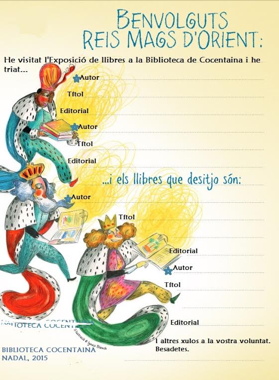 L’horari de Biblioteca és de dilluns a divendres de 9:30 a 11:30 i de 16 a 10 hores, dissabte de 10 a 13 hores. El més adient es visitar-la en família: mirar els llibres, triar els que més ens agraden, anotar-los en la carta i… desitjar que entre els regals apareguen eixos llibres especials que s’hem triat.