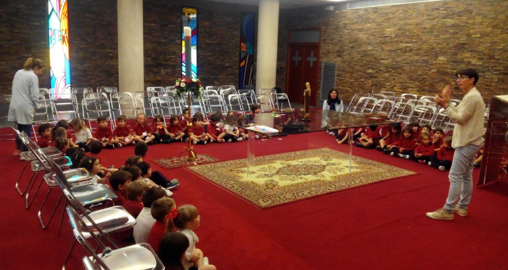 Hemos celebrado el día de la madre y  como dice la canción que hemos aprendido «Mis mamás son dos», hemos visitado a la Virgen en la Capilla. Allí le hemos presentado unas flores muy bonitas que le hemos hecho con mucho cariño.